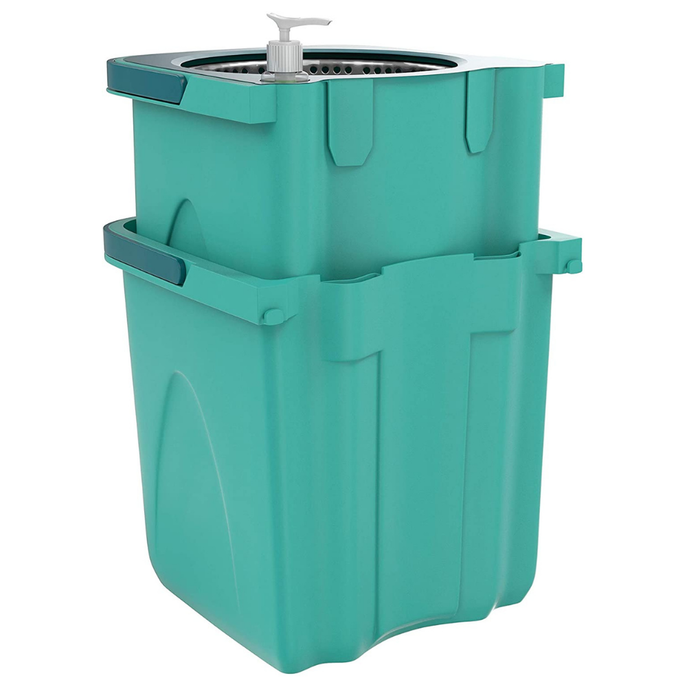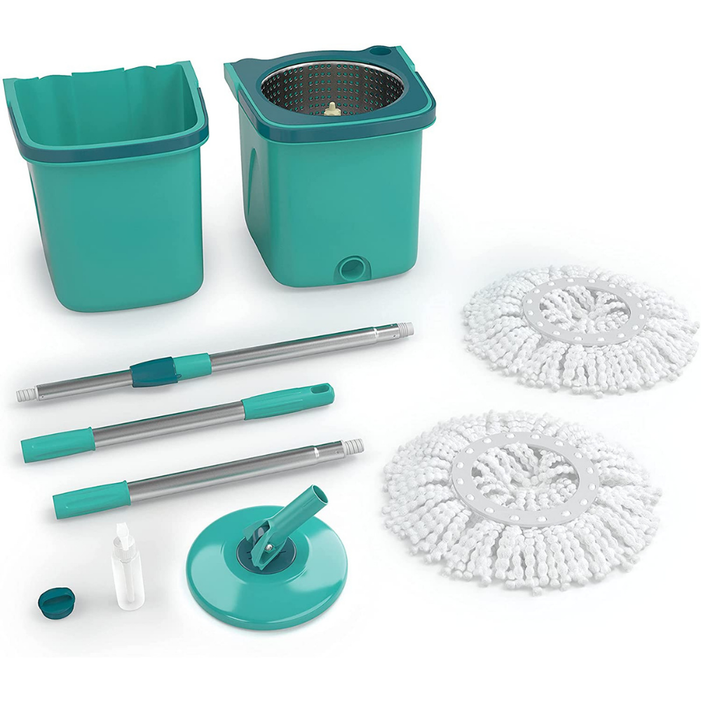 2 Baldes com alça;1 Dispenser para saneantes;1 Tampa;1 Cabo telescópico com base, cabo inferior e cabo supeior;2 Refis de microfibra.